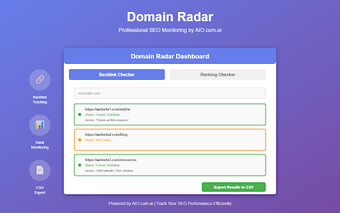 Domain Radar는 백링크 및 검색 엔진 순위를 추적하기 위해 특별히 설계된 강력한 SEO 모니터링 도구로, Chrome 애드온으로 제공됩니다. 이 무료 도구는 사용자가 다양한 URL에서 백링크의 존재와 품질을 확인할 수 있게 하며, 앵커 텍스트 사용, dofollow/nofollow 상태 및 rel 속성에 대한 자세한 통찰력을 제공합니다. 중요한 SEO 메트릭을 모니터링하는 과정을 간소화하는 사용자 친화적인 인터페이스를 제공합니다.